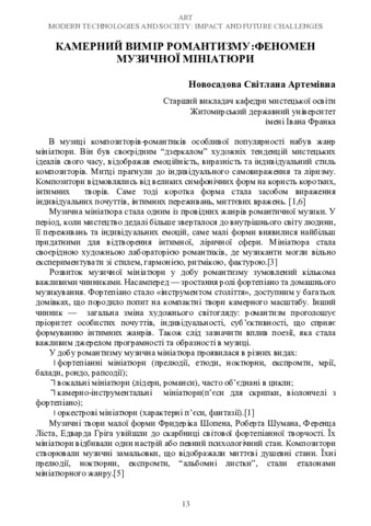 Новосадова С. А.ORCID: https://orcid.org/0000-0003-2937-8958 (2026) Камерний вимір романтизму: феномен музичної мініатюри. In: IV Міжнародна науково-практична конференція «Modern technologies and society: impact and future challenges», 26–28 січня 2026 р., Софія, Болгарія. С. 13–15.