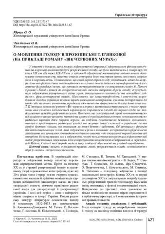 О-мовлення голоду в прозописьмі Т. П’янкової (на прикладі роману «Вік червоних мурах»).