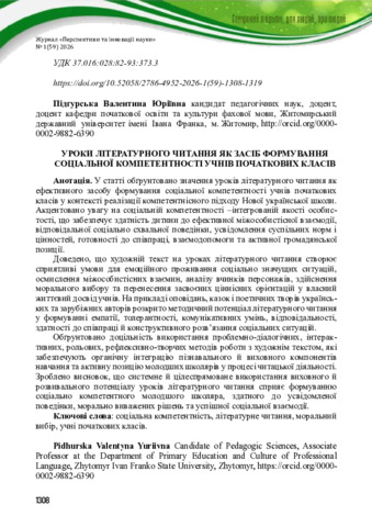 Уроки літературного читання як засіб формування соціальної компетентності учнів початкових класів.