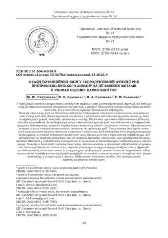 Євтушенко М. Ю.ORCID: https://orcid.org/0000-0002-8165-8802, Демченко В. О.ORCID: https://orcid.org/0000-0003-0225-3207, Демченко Н. А.ORCID: https://orcid.org/0000-0001-6469-760X, Клименко В. М.ORCID: https://orcid.org/0000-0002-4252-3059 (2025) Огляд потенційних змін у репродуктивній функції риб Дніпровсько-Бузького лиману за дії важких металів в умовах підриву Каховської ГЕС. Український журнал природничих наук. № 14. С. 33–45. ISSN 2786-6335. DOI: 10.32782/naturaljournal.14.2025.4.