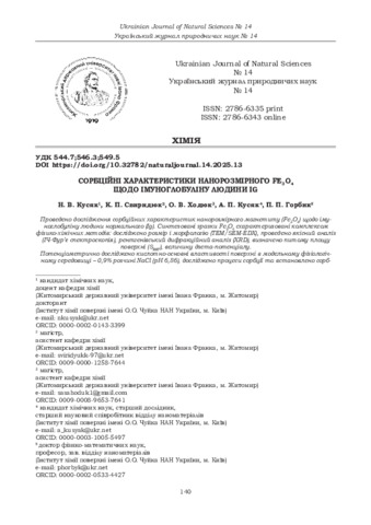 Кусяк Н. В.ORCID: https://orcid.org/0000-0002-0143-3399, Свиридюк К. П.ORCID: https://orcid.org/0009-0000-1258-7644, Ходюк О. В.ORCID: https://orcid.org/0009-0008-9653-7641, Кусяк А. П.ORCID: https://orcid.org/0000-0003-1005-5497, Горбик П. П.ORCID: https://orcid.org/0000-0002-0533-4427 (2025) Сорбційні характеристики нанорозмірного FE3O4 щодо імуноглобуліну людини Ig. Український журнал природничих наук. № 14. С. 140–149. ISSN 2786-6335. DOI: 10.32782/naturaljournal.14.2025.13.
