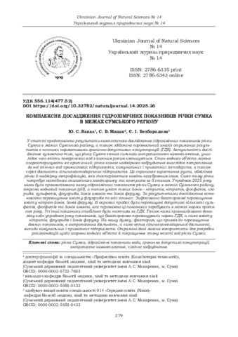 Вакал Ю. С.ORCID: https://orcid.org/0000-0002-8722-7683, Мацак С. В.ORCID: https://orcid.org/0000-0002-5658-0433, Безбородова Є. І. (2025) Комплексне дослідження гідрохімічних показників річки Сумка в межах Сумського регіону. Український журнал природничих наук. № 14. С. 279–288. ISSN 2786-6335. DOI: 10.32782/naturaljournal.14.2025.26.