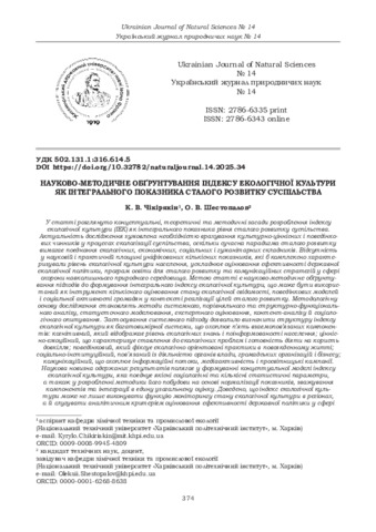 ДСТУ 8302:2015: Чікірякін К. В., Шестопалов О. В. Науково-методичне обґрунтування індексу екологічної культури як інтегрального показника сталого розвитку суспільства. Український журнал природничих наук. 2025. № 14. С. 374–382. DOI: 10.32782/naturaljournal.14.2025.34.