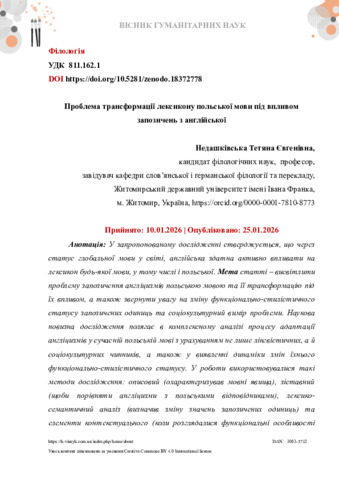 | ДСТУ 8302:2015: | Недашківська Т. Є. Проблема трансформації лексикону польської мови під впливом запозичень з англійської. Вісник гуманітарних наук. 2026. № 15. С. 1–16. DOI: 10.5281/zenodo.18372778. |