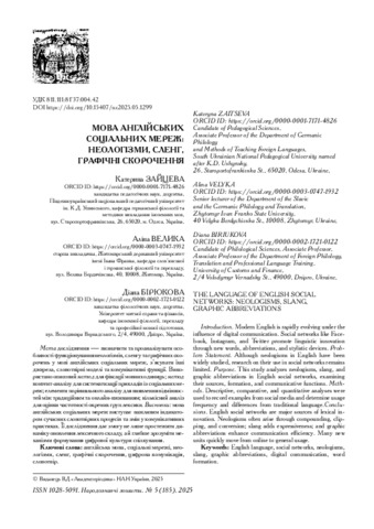 Анотація. Мета дослідження — визначити та проаналізувати особливості функціонування неологізмів, сленгу та графічних скорочень у мові англійських соціальних мереж, з’ясувати їхні джерела, словотвірні моделі та комунікативні функції. Використано описовий метод для фіксації мовних одиниць; метод контент-аналізу для систематизації прикладів із соціальних мереж; елементи порівняльного аналізу для виявлення відмінностей між традиційним та онлайн-вживанням; кількісний аналіз для оцінки частотності окремих груп лексики. Висновки: мова англійських соціальних мереж виступає важливим індикатором сучасних словотвірних процесів та змін у комунікативних практиках. Її дослідження дає змогу не лише простежити динаміку оновлення лексичного складу, а й глибше зрозуміти механізми формування цифрової культури спілкування.