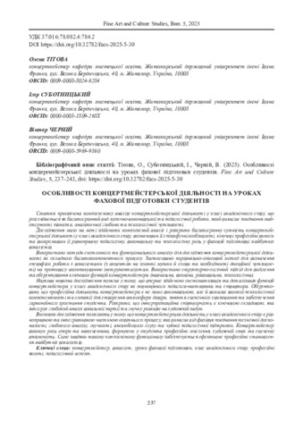Стаття присвячена комплексному аналізу концертмейстерської діяльності у класі академічного співу, що розглядається як багатогранний вид музично-виконавської та педагогічної роботи, який вимагає поєднання майстерності піаніста, аналітичної глибини та психологічної чутливості