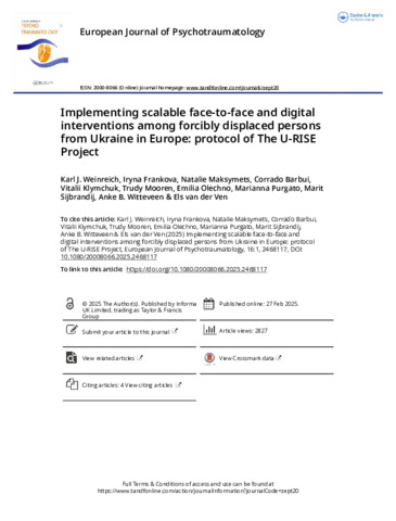Weinreich K. J.ORCID: https://orcid.org/0009-0005-7115-3631, Frankova I.ORCID: https://orcid.org/0000-0001-9371-6849, Maksymets Na., Barbui C.ORCID: https://orcid.org/0000-0003-1073-9282, Климчук В. О.ORCID: https://orcid.org/0000-0001-7898-5530, Mooren T.ORCID: https://orcid.org/0000-0003-0819-8640, Olechno E., Purgato M.ORCID: https://orcid.org/0000-0002-3783-8195, Sijbrandij M.ORCID: https://orcid.org/0000-0001-5430-9810, Witteveen A. B.ORCID: https://orcid.org/0000-0002-9636-7522, Ven E.ORCID: https://orcid.org/0000-0001-5103-7186 (2025) Implementing scalable face-to-face and digital interventions among forcibly displaced persons from Ukraine in Europe: protocol of The U-RISE Project. European Journal of Psychotraumatology. Т. 16, № 1. С. 1–12. ISSN 2000-8066. DOI: 10.1080/20008066.2025.2468117.