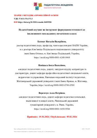 Бахмат Н. В.ORCID: https://orcid.org/0000-0001-6248-8468, Новіцька І. В.ORCID: https://orcid.org/0000-0003-0780-0580, Веремчук А. П.ORCID: https://orcid.org/0000-0002-3458-9584 (2026) Педагогічний коучинг як інструмент формування готовності до інклюзивного викладання у початкових класах. Педагогічна Академія: наукові записки. № 27. С. 1–21. ISSN 2786-9458. DOI: 10.5281/zenodo.18495520.