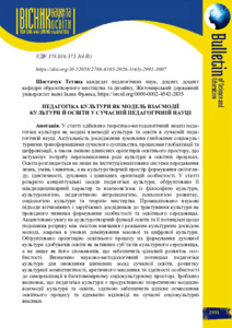 У статті здійснено теоретико-методологічний аналіз педагогіки культури як моделі взаємодії культури та освіти в сучасній педагогічній науці. Актуальність дослідження зумовлена глибокими соціокультурними трансформаціями сучасного суспільства, процесами глобалізації та цифровізації, а також зміною ціннісних орієнтирів освітнього простору, що актуалізує потребу переосмислення ролі культури в освітніх процесах. Освіта розглядається не лише як інституціоналізована система передавання знань, умінь і навичок, а як культуротворчий простір формування світогляду, ідентичності, духовних і ціннісних орієнтацій особистості. У статті розкрито концептуальні засади педагогіки культури, обґрунтовано її міждисциплінарний характер та взаємозв’язок із філософією культури, культурологією, педагогічною антропологією, психологією розвитку, соціологією культури та теорією мистецтва. Проаналізовано наукові підходи вітчизняних і зарубіжних дослідників до трактування культури як провідного чинника формування особистості та освітнього середовища. Акцентовано увагу на культуротворчий функції освіти та її потенціалі щодо подолання розриву між змістом навчання і реальним культурним досвідом молоді, зокрема в умовах домінування масової та цифрової культури. Обґрунтовано орієнтацію освітнього процесу на формування духовної культури здобувачів освіти як активних суб’єктів культурного середовища, а не лише як його споживачів, що забезпечить цілісний розвиток особистості. Визначено науково-методологічний потенціал педагогіки культури для оновлення ціннісних засад сучасної освіти, розвитку культурної компетентності, критичного мислення та здатності особистості до самореалізації в багатовимірному соціокультурному просторі. Зроблено висновок, що педагогіка культури є продуктивною теоретичною моделлю взаємодії культури та освіти, здатною забезпечити цілісне осмислення освітнього процесу та адекватні відповіді на сучасні соціокультурні виклики.