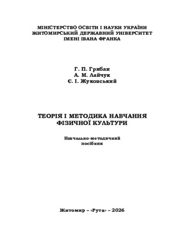 Грибан Г. П.ORCID: https://orcid.org/0000-0002-9049-1485, Лайчук А. М.ORCID: https://orcid.org/0000-0001-9102-1381, Жуковський Є. І.ORCID: https://orcid.org/0000-0002-4870-4248 (2026) Теорія і методика навчання фізичної культури:. 244 с. [Навчальний матеріал]