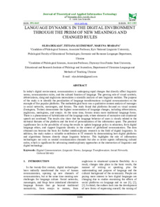 | ДСТУ 8302:2015: | Декало О. О., Кузьменко Т. М., Шарапа М. В. Language dynamics in the digital environment through the prism of new meanings and changed rules. Journal of Theoretical and Applied Information Technology. 2025. Т. 103, № 21. С. 9109–9119. |