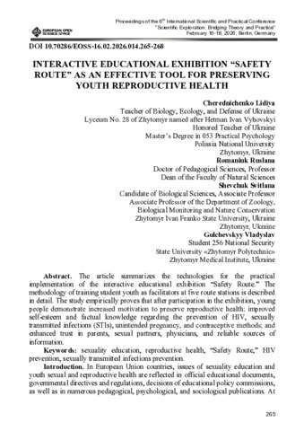 Чередніченко Л. В., Романюк Р. К.ORCID: https://orcid.org/0000-0002-6306-7427, Шевчук С. Ю.ORCID: https://orcid.org/0000-0001-6374-1859, Гульчевський В. І. (2026) Interactive Educational Exhibition “Safety Route” as an Effective Tool for Preserving Youth Reproductive Health. In: 6 Міжнародна науково-практична конференція «Scientific Exploration: Bridging Theory and Practice», 16–18 лютого 2026 р., Берлін, Німеччина. С. 265–268. DOI: 10.70286/EOSS-16.02.2026.