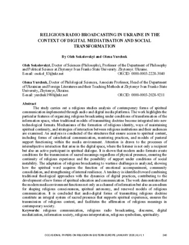 Соколовський О. Л.ORCID: https://orcid.org/0000-0003-2228-3040, Юрчук О. О.ORCID: https://orcid.org/0000-0003-2028-9211 (2026) Religious Radio Broadcasting in Ukraine in the Context of Digital Mediatisation and Social Transformation. Ocasional Papers on Religion in Eastern Europe. Т. 46, № 1. С. 240–261. ISSN 2693-2229. DOI: 10.55221/2693-2229.2747.