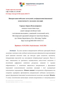 За умов масового використання мобільних пристроїв дітьми молодшого шкільного віку мобільні застосунки розглядаються як перспективний засіб навчання іноземної мови, що інтегрує ігрові механізми, наочність, інтерактивну взаємодію та можливості індивідуалізації навчання. Разом із тим, незважаючи на зростаючу зацікавленість педагогічної спільноти й дослідників цифровими освітніми ресурсами, питання їх науково обґрунтованого й методично виваженого використання у формуванні іншомовної компетентності молодших школярів і досі залишається недостатньо опрацьованим. Метою статті є теоретично обґрунтувати та емпірично перевірити ефективність використання мобільних застосунків у процесі формування іншомовної компетентності молодших школярів. Методи. У межах дослідження застосовано методи теоретичного й концептуального аналізу наукових джерел, порівняльного аналізу педагогічних підходів, структурно-функціонального осмислення, узагальнення педагогічного досвіду, а також аналіз результатів спостережень за навчальною діяльністю молодших школярів. Результати. Було визначено структурні компоненти іншомовної компетентності, які найбільш ефективно формуються за допомогою мобільних застосунків. Обґрунтовано педагогічні умови та методичні особливості впровадження цифрових ресурсів у навчальний процес, включно з інтеграцією у підручники, використанням ігрових форматів, диференціацією завдань та педагогічним супроводом. Емпірично підтверджено, що мобільні застосунки сприяють підвищенню рівня засвоєння лексики, граматики, розвитку аудіювання, говоріння, читання та самостійної навчальної діяльності. Висновки. У результаті проведеного дослідження було теоретично обґрунтовано та емпірично перевірено ефективність використання мобільних застосунків у формуванні іншомовної компетентності молодших школярів.