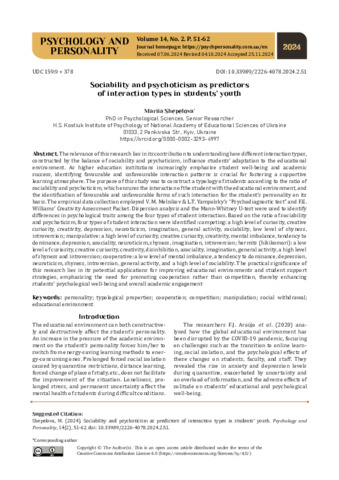 The relevance of this research lies in its contribution to understanding how different interaction types, constructed by the balance of sociability and psychoticism, influence students’ adaptation to the educational environment. As higher education institutions increasingly emphasise student well-being and academic success, identifying favourable and unfavourable interaction patterns is crucial for fostering a supportive learning atmosphere. The purpose of this study was to construct a typology of students according to the ratio of sociability and psychoticism, which ensures the interaction of the student with the educational environment, and the identification of favourable and unfavourable forms of such interaction for the student's personality on its basis. The empirical data collection employed V. M. Melnikov & L.T. Yampolsky’s “Psychodiagnostic test” and F.E. Williams’ Creativity Assessment Packet. Dispersion analysis and the Mann-Whitney U-test were used to identify differences in psychological traits among the four types of student interaction. Based on the ratio of sociability and psychoticism, four types of student interaction were identified: competing: a high level of curiosity, creative curiosity, creativity, depression, neuroticism, imagination, general activity, sociability, low level of shyness, introversion; manipulative: a high level of curiosity, creative curiosity, creativity, mental imbalance, tendency to dominance, depression, asociality, neuroticism, shyness, imagination, introversion; hermits (hikikomori): a low level of curiosity, creative curiosity, creativity, disinhibition, asociality, imagination, general activity, a high level of shyness and introversion; cooperative: a low level of mental imbalance, a tendency to dominance, depression, neuroticism, shyness, introversion, general activity, and a high level of sociability. The practical significance of this research lies in its potential applications for improving educational environments and student support strategies, emphasising the need for promoting cooperation rather than competition, thereby enhancing students’ psychological well-being and overall academic engagement.