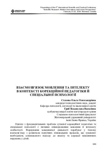 Взаємозв’язок мовлення та інтелекту в контексті корекційної педагогіки й спеціальної психології.