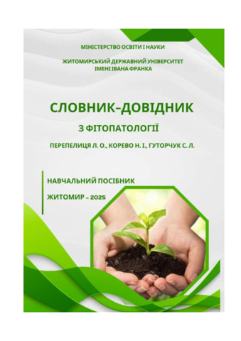 Навчальний посібник «Словник-довідник з фітопатології» підготовлено відповідно до програм освітньої компоненти «Фітопатологія» для студентів та викладачів вищих навчальних закладів, студентів біологічних факультетів університетів, педагогічних та сільськогосподарських вищих навчальних закладів, освітніх програм: «Біологія», «Тепличне господарство» та програм біологічного напрямку. Словник-довідник укладено з метою уніфікації термінології та формування цілісного уявлення про найважливіші поняття, пов’язані з етіологією, симптоматикою, класифікацією збудників, діагностикою й методами контролю хвороб рослин. Словник-довідник з фітопатології може бути корисним широкому колу користувачів, пов’язаних із вивченням, викладанням або практикою у сфері біології, агрономії та захисту рослин.