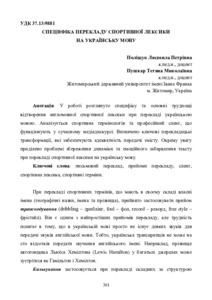 Поліщук Л. П.ORCID: https://orcid.org/0009-0009-2459-0192, Пушкар Т. М.ORCID: https://orcid.org/0000-0001-5060-7167 (2026) Специфіка перекладу спортивної лексики на українську мову. In: VI Міжнародна науково-практична конференція «Innovations of Modern Science and Education», 26–28 лютого 2026 р., Ванкувер, Канада. С. 361–362.
