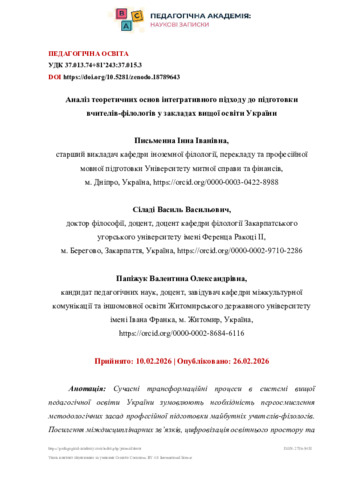 Письменна І. І.ORCID: https://orcid.org/0000-0003-0422-8988, Сіладі В. В.ORCID: https://orcid.org/0000-0002-9710-2286, Папіжук В. О.ORCID: https://orcid.org/0000-0002-8684-6116 (2026) Аналіз теоретичних основ інтегративного підходу до підготовки вчителів-філологів у закладах вищої освіти України. Педагогічна Академія: наукові записки. № 27. С. 1–20. ISSN 2786-9458. DOI: 10.5281/zenodo.18789643.