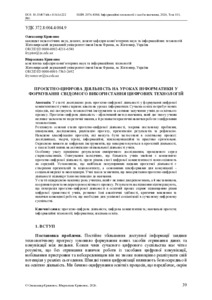 У статті досліджено роль проєктно-цифрової діяльності у формуванні цифрової компетентності учнів старших класів на уроках інформатики. Сучасна освіта потребує нових підходів, які поєднують технологічні інструменти та активне залучення учнів до освітнього процесу. Проєктно-цифрова діяльність – ефективний метод навчання, який дає змогу учням не лише засвоювати теоретичні знання, а й розвивати практичні навички роботи з цифровими технологіями.