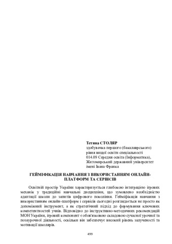 Столяр Т. О. (2026) Гейміфікація навчання з використанням онлайн-платформ та сервісів. In: Міжнародна науково-практична конференція «Сучасні трансформації педагогічної освіти: проблеми теорії і практики», 29–30 січня 2026 р., Запоріжжя. С. 499–502. DOI: 10.33842/conf.stpo.2026.
