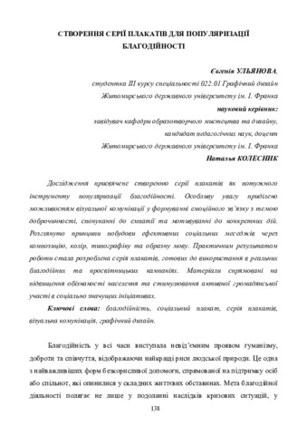 Ульянова Є. В. (2026) Створення серії плакатів для популяризації благодійності. In: V Всеукраїнська студентська науково-практична конференція «Професійне зростання молоді: ідеї, траєкторії, перспективи», 28 січня 2026 р., Хмельницький. С. 138–143.