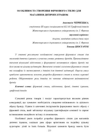 Чернецька А. С. (2026) Особливості створення фірмового стилю для магазинів дитячих іграшок. In: V Всеукраїнська студентська науково-практична конференція «Професійне зростання молоді: ідеї, траєкторії, перспективи», 28 січня 2026 р., Хмельницький. С. 233–238.