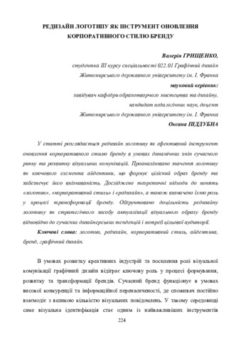 Грищенко В. М. (2026) Редизайн логотипу як інструмент оновлення корпоративного стилю бренду. In: V Всеукраїнська студентська науково-практична конференція «Професійне зростання молоді: ідеї, траєкторії, перспективи», 28 січня 2026 р., Хмельницький. С. 224–228.