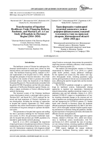 Грищук С. М.ORCID: https://orcid.org/0000-0002-5553-8110, Бовсуновська Н. М.ORCID: https://orcid.org/0000-0002-8137-114X, Гарлінська А. М.ORCID: https://orcid.org/0000-0001-7859-8637, Чайка Ю. Ю.ORCID: https://orcid.org/0000-0002-3965-6088, Грищук Д. С.ORCID: https://orcid.org/0009-0007-9819-2539 (2025) Transformation of Inpatient Healthcare Under Financing Reform, Pandemic, and Martial Law: A Case Study of Hospitals in Zhytomyr Region (2014–2024). Україна. Здоров’я нації. № 82. С. 103–112. ISSN 2077-6594. DOI: 10.32782/2077-6594/2025.4/11.