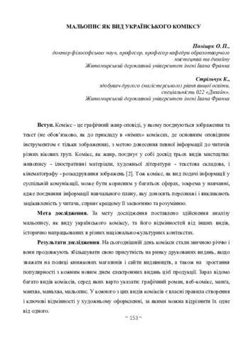 Поліщук О. П.ORCID: https://orcid.org/0000-0002-1095-8031, Стрільчук К. О.ORCID: https://orcid.org/0009-0002-2826-967X (2026) Мальопис як вид українського коміксу. In: ІІ Всеукраїнська науково-практична конференція «Мистецтво та освіта ХХІ століття: тенденції, проблеми, перспективи», 30 жовтня 2025 р., Полтава. С. 150–152.