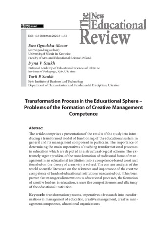 Ogrodzka-Mazur Е.ORCID: https://orcid.org/0000-0001-9990-6176, Саух І. В.ORCID: https://orcid.org/0000-0002-3812-6579, Саух Ю. П.ORCID: https://orcid.org/0009-0006-6684-8022 (2025) Transformation Process in the Educational Sphere – Problems of the Formation of Creative Management Competence. The New Educational Review. Т. 81, № 3. С. 201–211. ISSN 1732-6729. DOI: 10.15804/tner.2025.81.3.13.