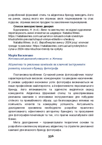 Василенко М. В. (2025) Айдентика та рекламна кампанія як ключові інструменти розвитку власного бренду фотографа. In: VI Міжнародна науково-практична конференція «Феномен культури постглобалізму: культурна демократизація, креативні простори та культурні політики», 27–28 листопада 2025 р., Київ. С. 336–338.