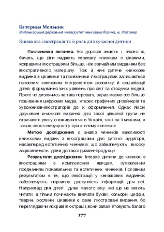 Мельник К. І. (2025) Книжкова ілюстрація та її роль для сучасної дитини. In: VI Міжнародна науково-практична конференція «Феномен культури постглобалізму: культурна демократизація, креативні простори та культурні політики», 27–28 листопада 2025 р., Київ. С. 177–179.