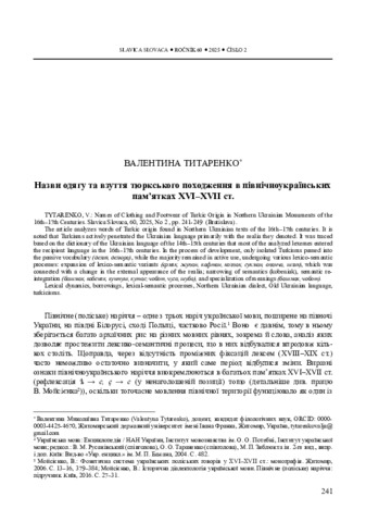 | ДСТУ 8302:2015: | Титаренко В. М. Назви одягу та взуття тюркського походження в північноукраїнських пам’ятках XVI–XVII cт.. Slavica Slovaca. 2025. Т. 60, № 2. С. 241–250. |