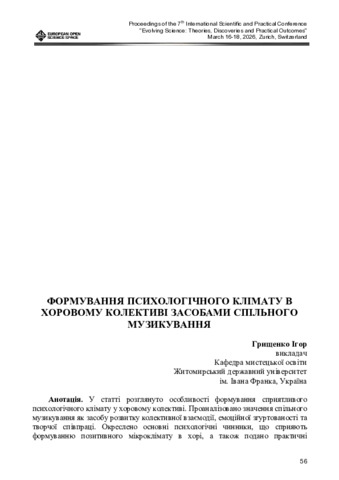 Грищенко І. Д.ORCID: https://orcid.org/0009-0005-9527-4614 (2026) Формування психологічного клімату в хоровому колективі засобами спільного музикування. In: 7 Міжнародна науково-практична конференція «Evolving Science: Theories, Discoveries and Practical Outcomes», 16–18 березня 2026 р., Цюріх, Швейцарія. С. 56–61. DOI: 10.70286/eoss-16.03.2026.
