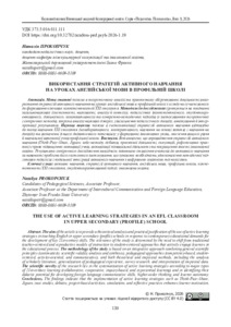 Мета статті полягає в теоретичному аналізі та практичному обґрунтуванні доцільності вико-ристання стратегій активного навчання на уроках англійської мови в профільній школі з огляду на сучасні вимоги до формування ключових компетентностей ХХІ століття. Методологія дослідження ґрунтується на поєднанні загальнонаукових (системності, науковості, аналізу й синтезу), педагогічних (компетентнісного, студентоорі-єнтованого, діяльнісного, комунікативного) та конкретно-методичних підходів із застосуванням теоретичних і емпіричних методів, зокрема аналізу наукових джерел, узагальнення педагогічного досвіду, анкетування й інтер-претації результатів. Наукова новизна полягає в систематизації стратегій активного навчання відповідно до типів навчання ХХІ століття (колаборативного, кооперативного, навчання на основі запитів і навчання на досвіді) та визначенні їхнього дидактичного потенціалу у формуванні іншомовних умінь, мислення вищого рівня й навчальної автономії учнів профільної школи. Висновки. Встановлено, що впровадження стратегій активного навчання (Think–Pair–Share, Jigsaw, кейс-методу, дебатів, проєктної діяльності, симуляцій, рефлексивних практик) сприяє підвищенню мотивації учнів, активізації пізнавальної діяльності та покращенню якості іншомовної освіти. Результати емпіричного дослідження засвідчили позитивне ставлення вчителів до активного навчання за наявності проблеми його системного застосування, що зумовлює необхідність удосконалення методичної підготовки педагогів і подальшої інтеграції активного навчання з цифровими освітніми технологіями.