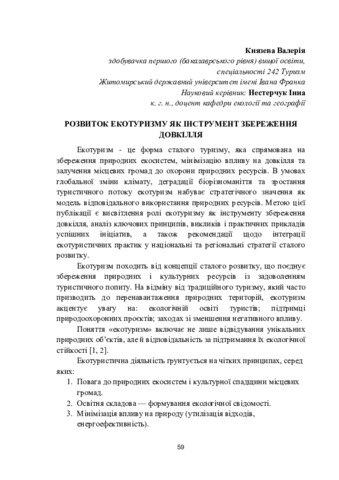 Князєва В. О. (2026) Розвиток екотуризму як інструмент збереження довкілля. In: III Всеукраїнська науково-практична конференція з міжнародною участю «Актуальні проблеми та перспективи розвитку туризму», 12–13 лютого 2026 р., Хмельницький. С. 59–61.