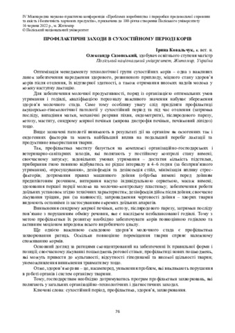 Ковальчук І. І.ORCID: https://orcid.org/0000-0002-2421-7533, Сазонський О. (2022) Профілактичні заходи в сухостійному періоді корів. In: IV Міжнародна науково-практична конференція «Проблеми виробництва і переробки продовольчої сировини та якість і безпечність харчових продуктів», присвячена до 100-річчя створення Поліського університету, 16 червня 2022 р., Житомир. ст. 76.
