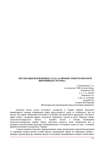 Степаниденко С. А., Ковальчук І. В.ORCID: https://orcid.org/0000-0002-2726-2866, Ковальчук І. І.ORCID: https://orcid.org/0000-0002-2421-7533, Загоруй І. М. (2015) Організація відтворення стада за промислової технології виробництва молока. In: Міжнародна науково-практична конференція «Аграрна наука, освіта, виробництво: європейський досвід для України», 17–18 листопада 2015 р., Житомир. С. 361–363.