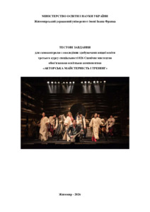 Тестові завдання розроблено для самоконтролю з оволодіння здобувачами вищої освіти третього курсу освітньою компонентою «Сценічна майстерність і тренінг» у відповідності з діючою навчальною програмою і побудовано за принципом програмованої перевірки знань з 4 модулів курсу, що дозволяє визначити рівень засвоєння теоретичного матеріалу. Матеріали призначені для здобувачів вищої освіти, які навчаються за освітньою програмою «Сценічне мистецтво» першого (бакалаврського) рівня вищої освіти.