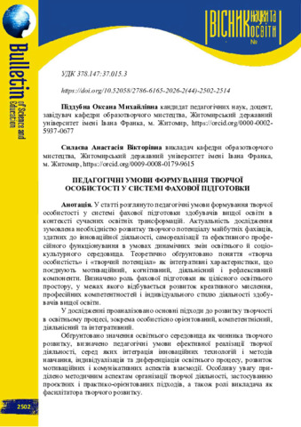 У статті розглянуто педагогічні умови формування творчої особистості у системі фахової підготовки здобувачів вищої освіти в контексті сучасних освітніх трансформацій. Актуальність дослідження зумовлена необхідністю розвитку творчого потенціалу майбутніх фахівців, здатних до інноваційної діяльності, самореалізації та ефективного професійного функціонування в умовах динамічних змін освітнього й соціокультурного середовища. Теоретично обґрунтовано поняття «творча особистість» і «творчий потенціал» як інтегративні характеристики, що поєднують мотиваційний, когнітивний, діяльнісний і рефлексивний компоненти. Визначено роль фахової підготовки як цілісного освітнього простору, у межах якого відбувається розвиток креативного мислення, професійних компетентностей і індивідуального стилю діяльності здобувачів вищої освіти.
