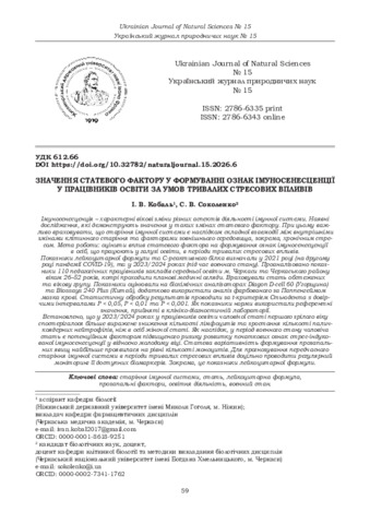 | ДСТУ 8302:2015: | Кобаль І. В., Соколенко С. В. Значення статевого фактору у формуванні ознак імуносенесценції у працівників освіти за умов тривалих стресових впливів. Український журнал природничих наук. 2026. № 15. С. 59–71. DOI: 10.32782/naturaljournal.15.2026.6. |