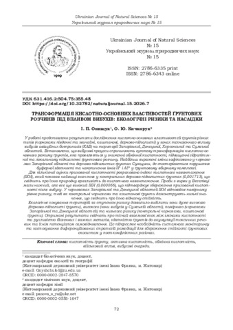 | ДСТУ 8302:2015: | Онищук І. П., Кичкирук О. Ю. Трансформація кислотно-основних властивостей ґрунтових розчинів під впливом вибухів: екологічні ризики та наслідки. Український журнал природничих наук. 2026. № 15. С. 72–82. DOI: 10.32782/naturaljournal.15.2026.7. |