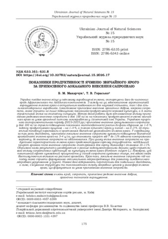 ДСТУ 8302:2015: Макарчук Б. М., Герасько Т. В. Показники продуктивності ячменю звичайного ярого за припосівного локального внесення сапропелю. Український журнал природничих наук. 2026. № 15. С. 175–184. DOI: 10.32782/naturaljournal.15.2026.17.