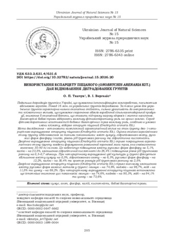 | ДСТУ 8302:2015: | Ткачук О. П., Вергеліс В. І. Використання еспарцету піщаного (Onobrychis arenaria Kit.) для відновлення деградованих ґрунтів. Український журнал природничих наук. 2026. № 15. С. 205–214. DOI: 10.32782/naturaljournal.15.2026.20. |