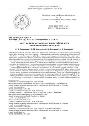 | ДСТУ 8302:2015: | Вміст важких металів в організмі дійних корів з різними раціонами годівлі / С. В. Портянник та ін. Український журнал природничих наук. 2026. № 15. С. 280–288. DOI: 10.32782/naturaljournal.15.2026.27. |