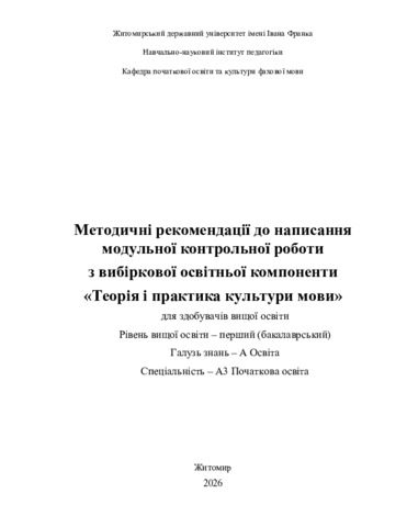 Підгурська В. Ю.ORCID: https://orcid.org/0000-0002-9882-6390, Голубовська І. В.ORCID: https://orcid.org/0000-0002-0875-8487, Гаращук К. В.ORCID: https://orcid.org/0000-0003-4518-3114 (2026) Методичні рекомендації до написання модульної контрольної роботи з вибіркової освітньої компоненти «Теорія і практика культури мови» : для здобувачів першого (бакалаврського) рівня вищої освіти галузі знань А Освіта спеціальності A3 Початкова освіта. 44 с. [Навчальний матеріал]