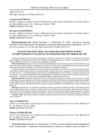 Роговська Є. В.ORCID: https://orcid.org/0000-0001-9456-5480, Федорченко В. К.ORCID: https://orcid.org/0009-0000-6398-0585 (2025) Аматорські вокальні ансамблі як популярна форма музикування в сучасному народнопісенному виконавстві. Fine Art and Culture Studies. № 6. С. 258–263. ISSN 2786-5428. DOI: 10.32782/facs-2025-6-34.