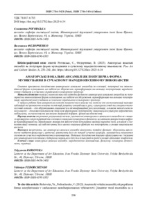 Стаття присвячена дослідженню аматорських вокальних ансамблів як ключової, популярної та життєздатної форми музикування, що забезпечує збереження, трансформацію та активну популяризацію народнопісенної спадщини в сучасному українському культурному просторі. Мета дослідження полягає у комплексному дослідженні феномену аматорських вокальних ансамблів як популярної та життєздатної форми музикування, що забезпечує збереження, трансформацію та активну популяризацію народнопісенної спадщини в сучасному українському культурному просторі. У процесі роботи були використані методи теоретичного аналізу та синтезу для систематизації наукових публікацій та визначення основних тенденцій розвитку ансамблевого руху; культурологічний та історикотипологічний методи – для обґрунтування соціальної та ідентифікаційної ролі колективів; а також метод системного аналізу – для виявлення взаємозв’язків між факторами популярності (національно-культурне відродження, мобільність, осучаснення) та викликами (кадровий дефіцит, фінансові обмеження). Наукова новизна отриманих результатів полягає у визначенні аматорського вокального ансамблю як «живого архіваріуса» мікртрадицій та ключового соціально-культурного феномену, що активно використовує цифрову трансформацію та гібридизацію жанрів для забезпечення неперервної еволюції народної пісні, а також у систематизації чинників, що забезпечують його високу соціальну функцію та популярність в умовах національних викликів. Висновки засвідчують, що аматорські вокальні ансамблі виконують подвійну функцію: зберігають автентичне надбання фольклору і, водночас, адаптують його до потреб сучасної культури, залишаючись незамінним елементом сучасного народнопісенного виконавства. Подальші дослідження доцільно сфокусувати на з’ясуванні ролі аматорських колективів у підтримці морального духу та культурній терапії в умовах військових конфліктів.