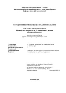 Ковтун Н. М.ORCID: https://orcid.org/0000-0002-5529-8655 (2026) Методичні матеріали до практичних занять обов’язкової освітньої компоненти «Філософська антропологія. Духовний досвід людини в інформаційну епоху» для підготовки здобувачів другого (магістерського) рівня вищої освіти спеціальності В 10 Філософія освітньої програми Філософія та феноменологія духовного досвіду людини. 34 с. [Навчальний матеріал]